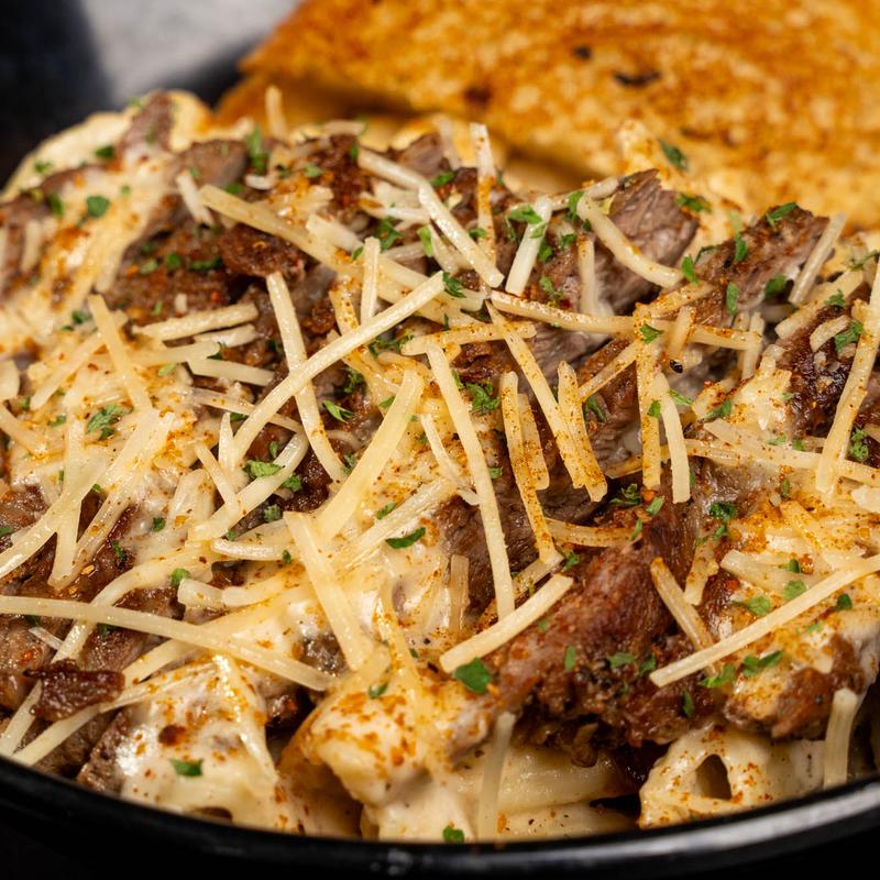 Penne alfredo pasta with ribeye steak topped with parmesan cheese and cajan seasoning. Comes with 1 piece of garlic bread