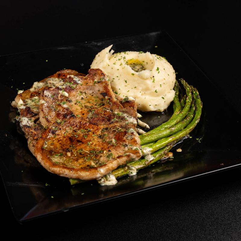 2 bone-in grilled pork chops topped with sautéed mushrooms and onions, with your choice of 2 sides and a crescent